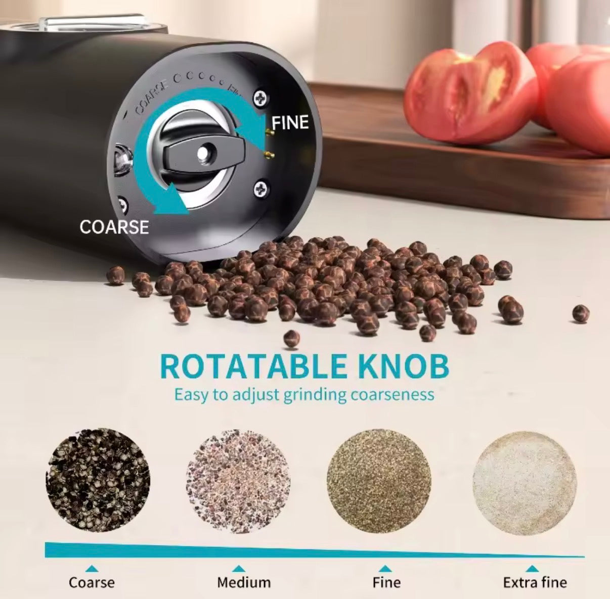 Molinillo automático de sal y pimienta con carga USB. Ajustable, recargable y fácil de usar, ideal para especias y cocina moderna.
